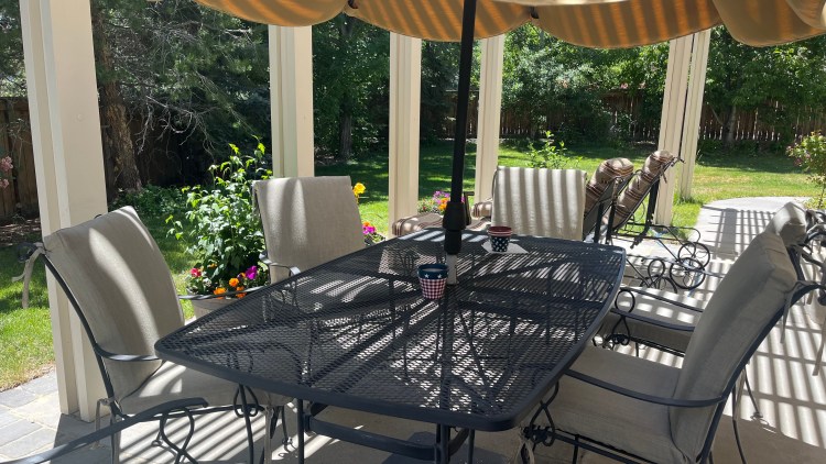 Also, the winter was harsh on our fence and yard so we had it repaired and the brick replaced with pavers and updated. When I saw how fresh it all looked, I decided to make new seat cushions for my patio chairs as well. I was going to do that last year and bought all the materials to do so but got busy with art and shows so I never made them. I thought it is now or never. This is the result.